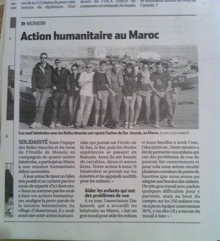 Toute l’équipe des Belles Binocles et Au creux de l’oreille est partie en voyage humanitaire à en novembre 2012 pour équiper une école marocaine de soins auditifs et de lunettes. L’objectif est de permettre aux enfants qui apprennent à lire de voir correctement.